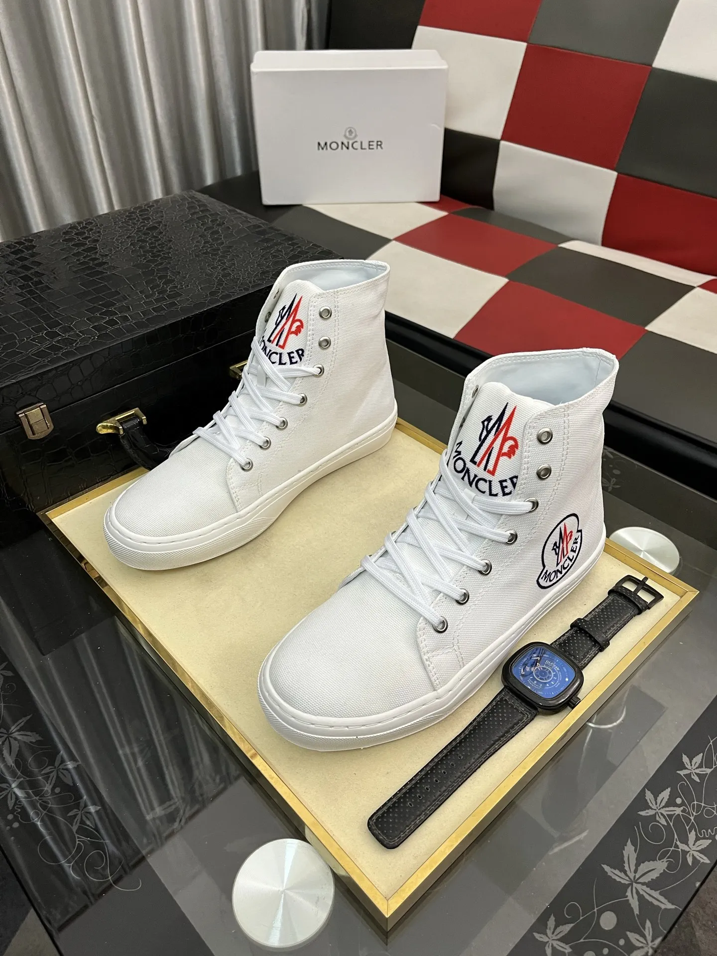 Wholeale cheap replica Moncler High Tops Shoes For Men #1399820 prices $85.00 USD online, outlet Gender MenSize US 4=EUR(38), US 5=EUR(39), US 6=EUR(40), US 7=EUR(41), US 8=EUR(42), US 9=EUR(43), US 10=EUR(44)! Wholesale new arrivals cheap fake Moncler High Tops Shoes enjoy free shipping and 66%-OFF with best quality! The hot on sale style Moncler High Tops Shoes For Men #1399820.